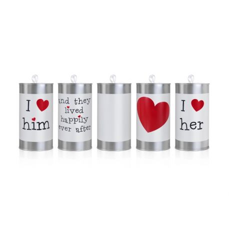 Plechovky na dekoráciu svadobného auta. V balení je 5 ks plechoviek o rozmeroch 14cm x 7cm. Na plechovkách sú upevnené biele stužky, ktoré umožnia plechovky prichytiť o svadobné auto. Cena je za balenie.